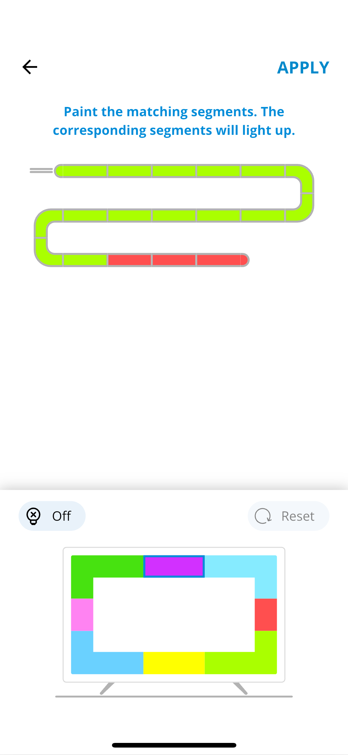 - Tap on the linear light drawing at the top of the app screen to paint the matching segments with the selected color. Note: the corresponding segments on the actual light will light up so you can better identify the given segments position and length.